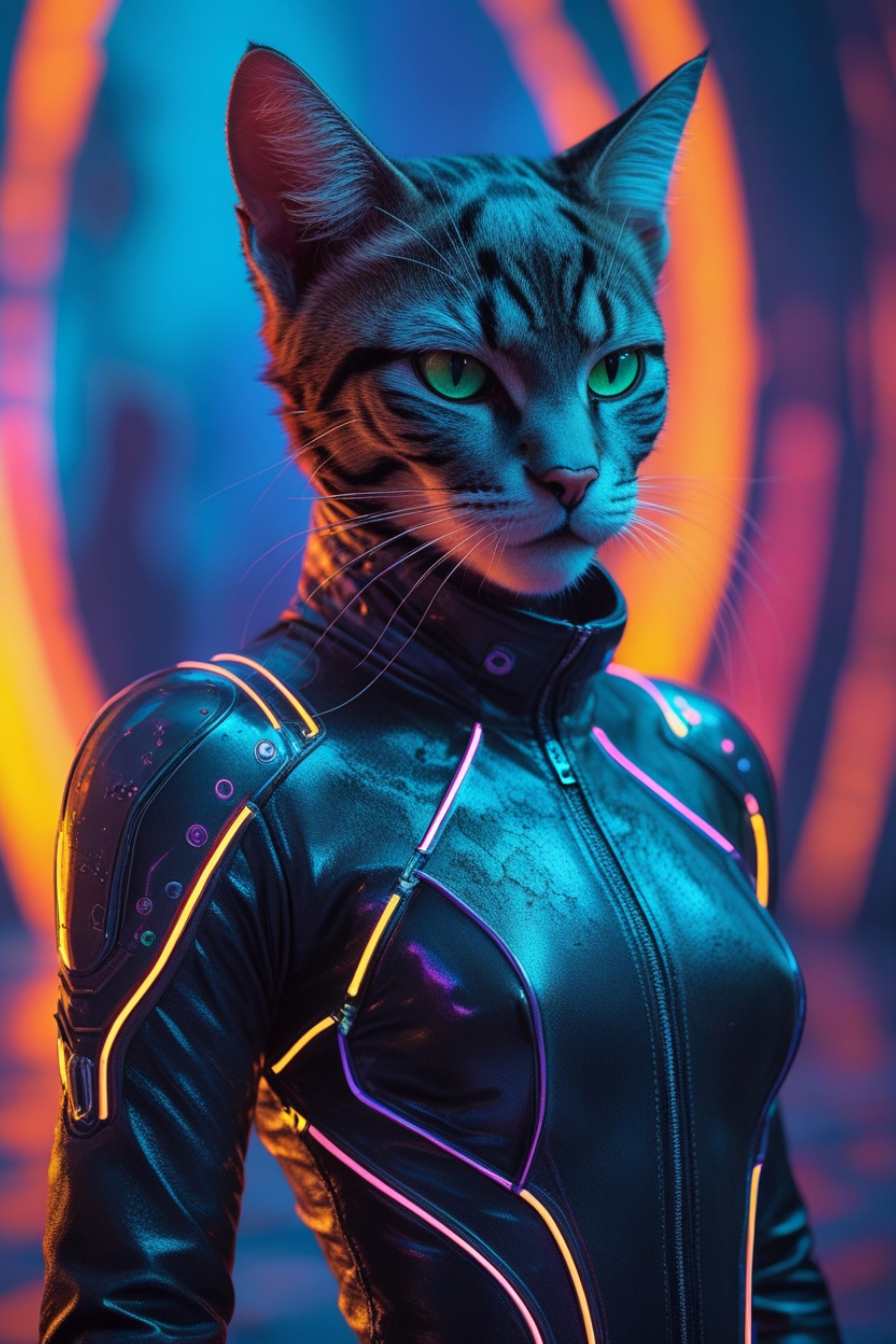 A futuristic feline strutting through a neon-lit cyber city. This AI-generated art blends metallic textures with the charm of a cat. Bring a touch of sci-fi elegance into your space.